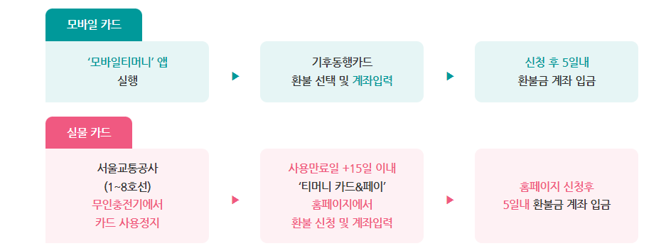 모바일카드는 티머니앱을 설치 후 회원가입하여 기후동행카드 발급 및 충전을 하시면 됩니다.