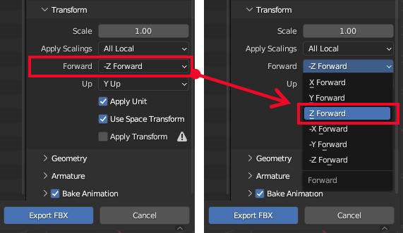 이와 같은 좌표계의 차이때문에 블렌더3D에서 유니티나 언리얼엔진같은 게임엔진으로 export 하면 오브젝트의 방향이 뒤집혀서 나타나는 현상이 생깁니다. 이럴때는 export할 때 Z축의 방향을 반대로 설정하여 변환해주면 해결됩니다.