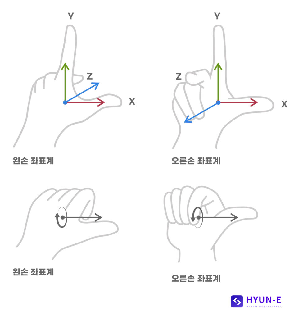 3D좌표계는 X, Y, Z 축으로 구성되어 있습니다. 3차원 공간상에서 회전, 움직임, 위치 등을 파악하기 위한 지표로 사용되는데 이런 3D좌표계는 크게 왼손좌표계와 오른손좌표계로 나뉩니다. 두 좌표계의 차이는 Z축의 방향과 회전방향입니다.