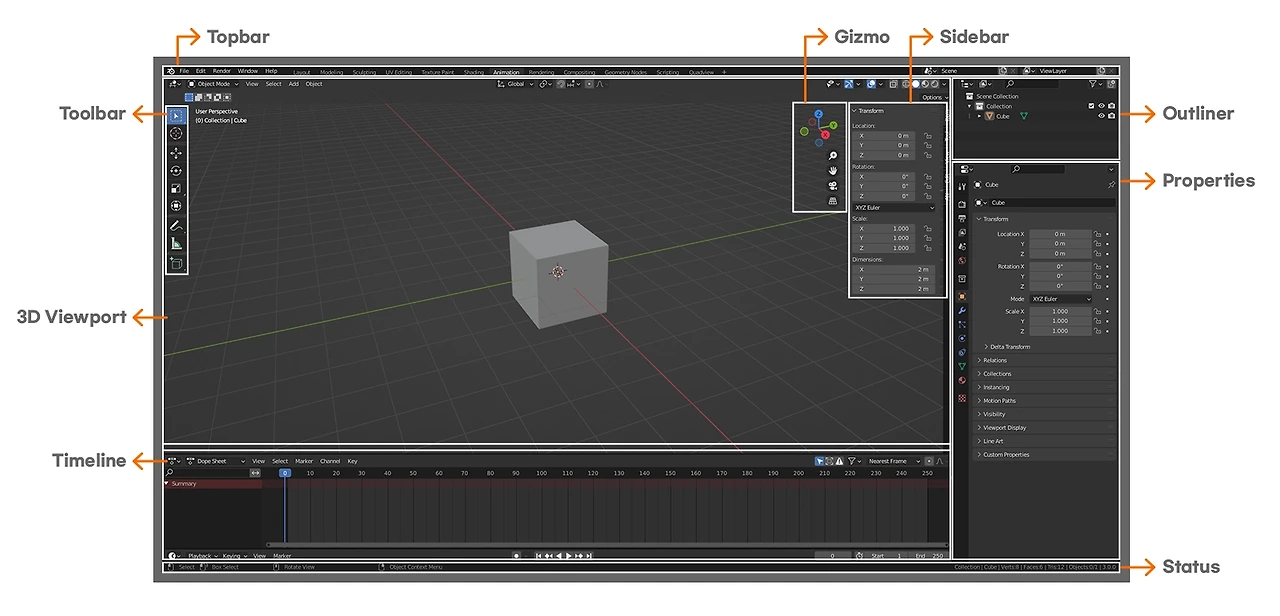 - 3D Viewport - 주작업 공간으로 실질적인 3D 모델링 작업을 할 때 사용되는 화면입니다.
