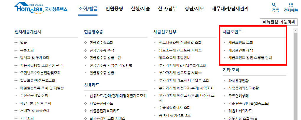 국세청홈택스 홈페이지로 접속 후 로그인 -> 조회/발급 -> 세금포인트 -> 세금포인트 조회