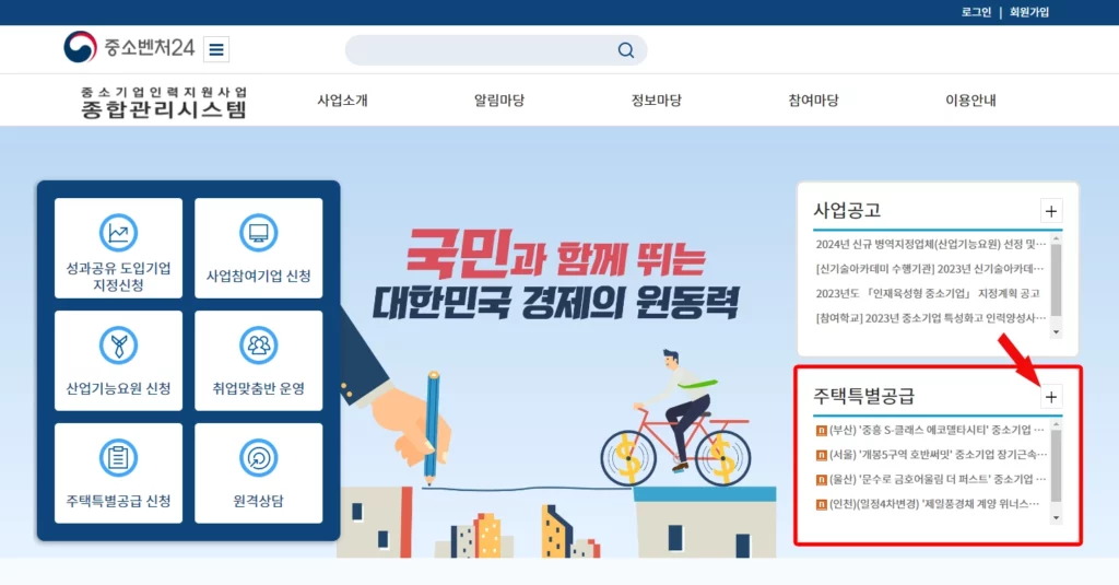 중소기업 인력자원 종합관리시스템에 접속하면 아래이미지의 우측하단에 표시해둔 주택특별공급제도의 + 버튼을 클릭합니다. 그러면 주택특별공급 대상 아파트의 리스트를 볼 수 있습니다.